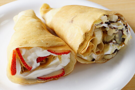 - クレープ(Crêpe Sucrée):主原料は小麦粉と砂糖。味付けは甘い(シュクレ)。用途はデザート系(食後の甘味)。